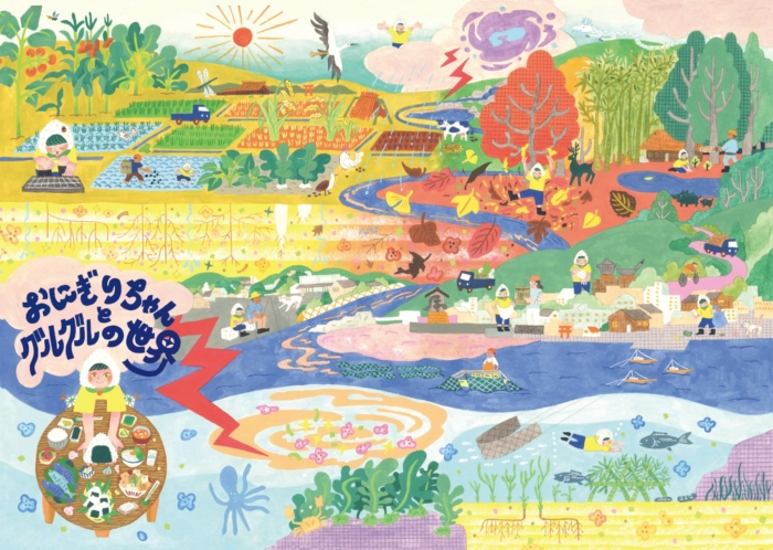 おにぎりちゃんの旅を、ひとりひとりの視点から見てほしいです。そして、グルグル(循環)の世界を、それぞれの立場から言葉にして解説してみてほしいのです。もしあなたが農家さんなら、どんなふうにこの世界と農業の繋がりを子どもたちに解説しますか?もしあなたが漁師さんなら、学校の先生なら、パパやママなら、子どもたちにどう説明して、どんなことを感じてほしいでしょうか?その自由さを損なわないように、イラスト面には文字を入れていません。また小さな子どもとも楽しい時間を作ってもらいたいと、ネコやイヌなど身近な生き物も登場させているので「ネコちゃんは?ワンちゃんはどこ?」といった遊び方も楽しんでほしいです。ぜひ、それぞれの立場からおにぎりちゃんを楽しんでください。
