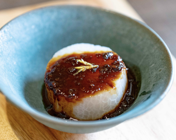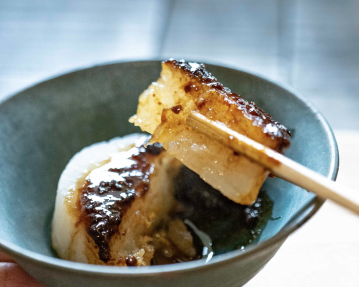大根に味噌だれをかけ、仕上げに柚子の皮を添えたら完成。